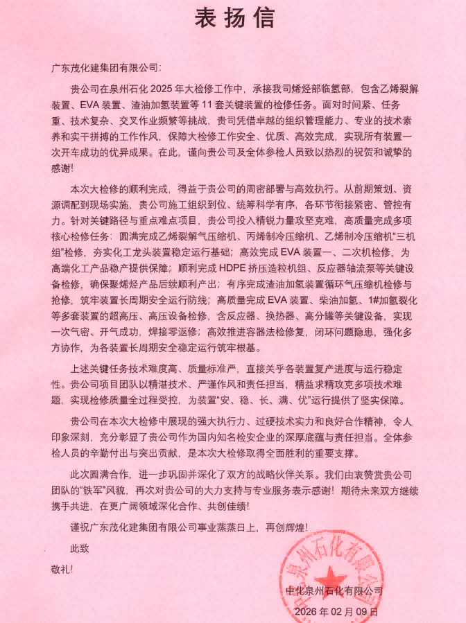喜讯!茂化建收到泉州石化的表扬信