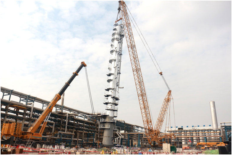 1月16日,总重189吨、高55米减压分馏塔(C501)整体一次吊装成功