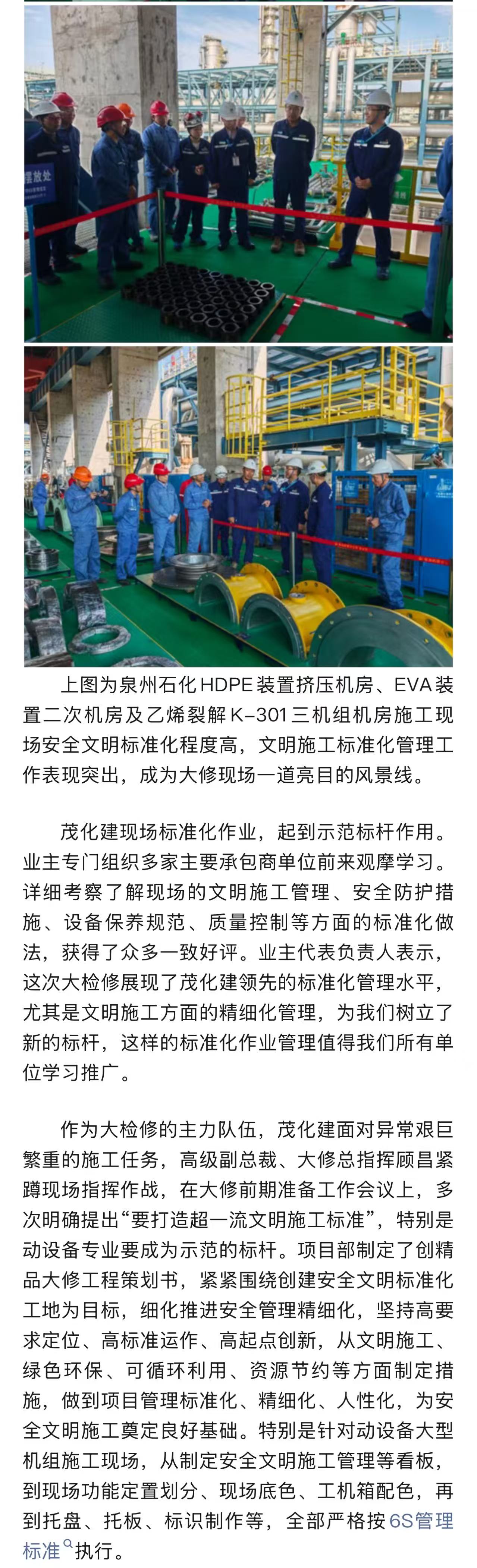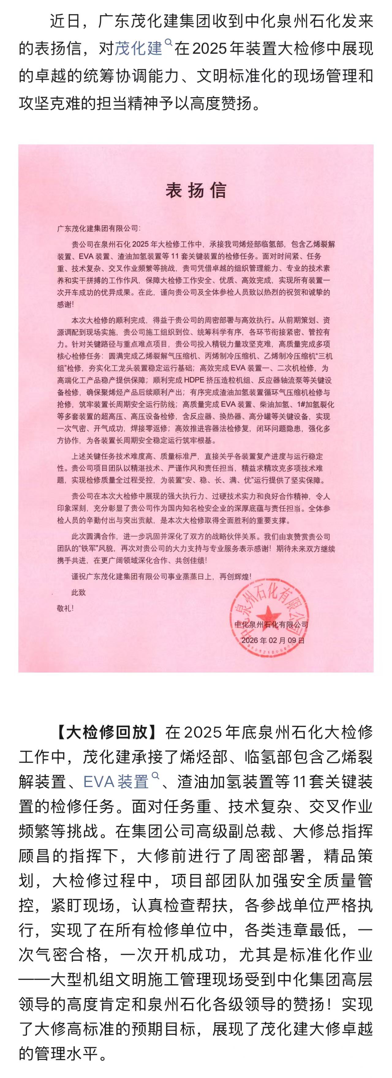 喜讯!茂化建收到泉州石化的表扬信