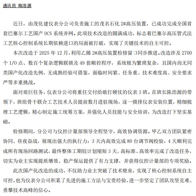 仪表分公司圆满完成全国首套巴塞尔工艺国产DCS 系统并网改造
