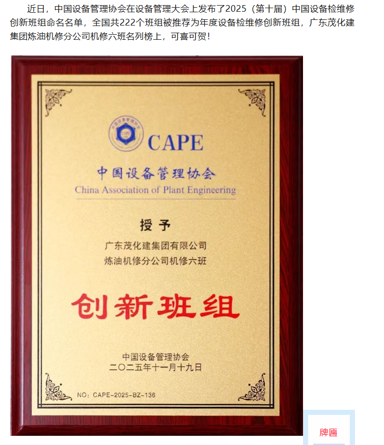 喜报 | 炼油机修六班荣获全国”设备检维修创新班组“称号