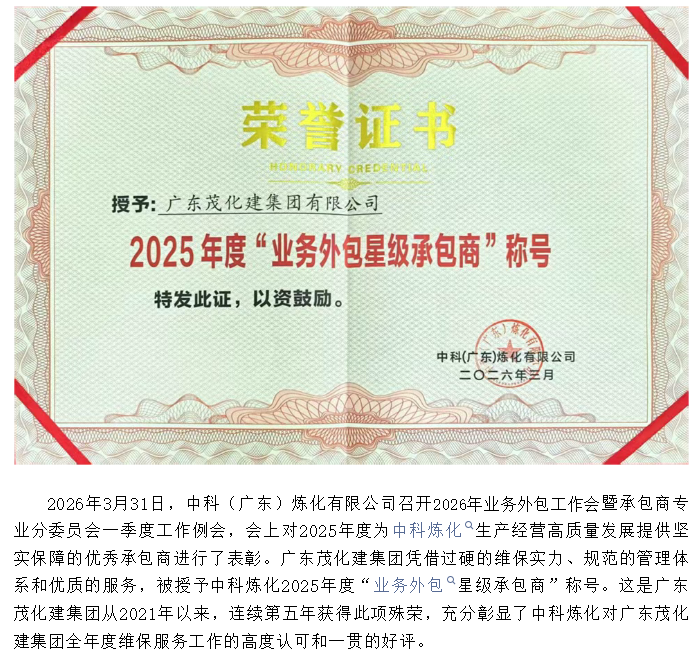 喜报|荣获中科炼化2025年度“ 业务外包星级承包商”称号