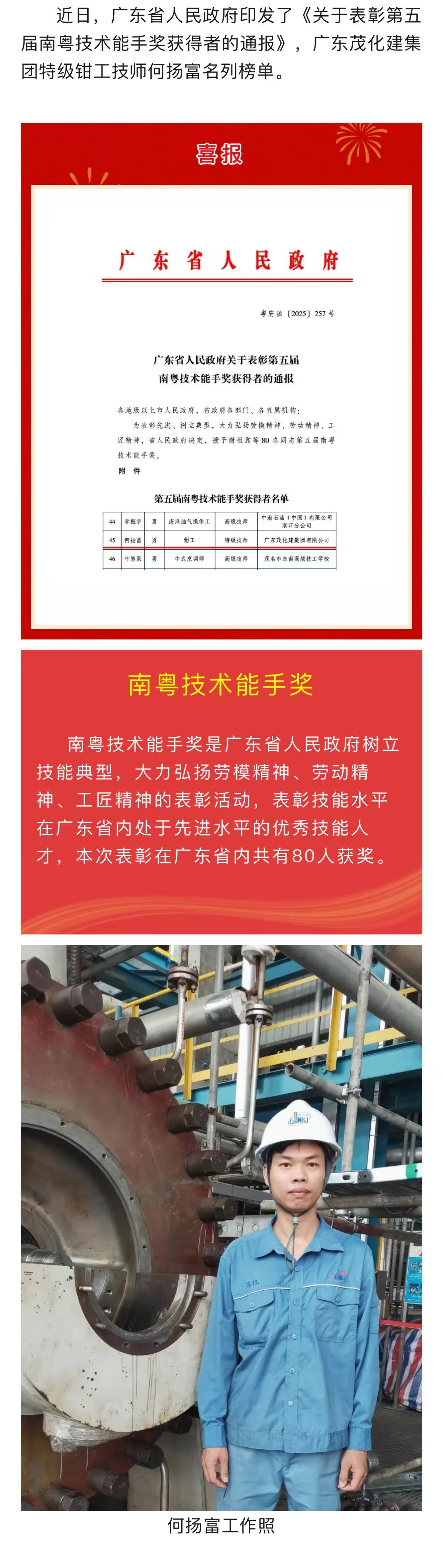喜报 | 何扬富被授予第五届“南粤技术能手奖”