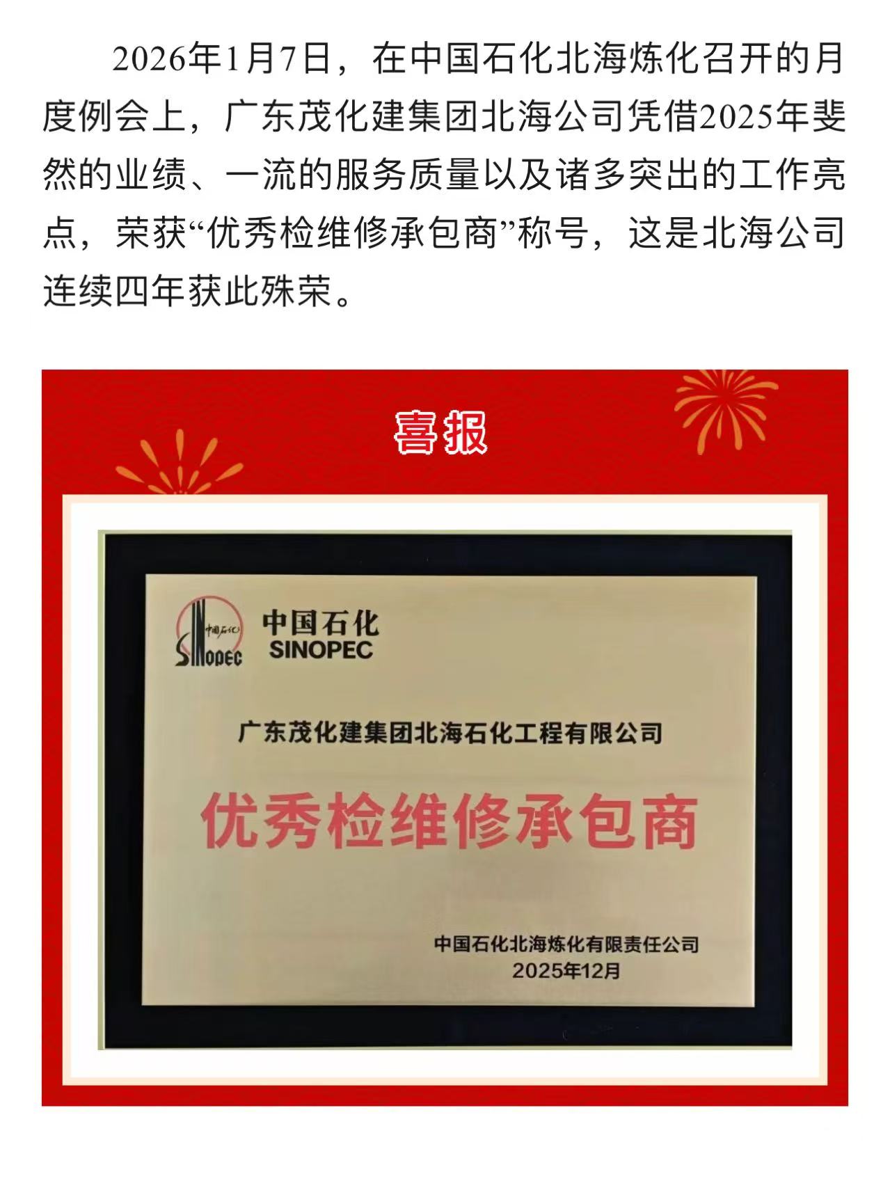 喜报 | 广东茂化建集团北海公司荣获2025年度“优秀检维修承包商”称号